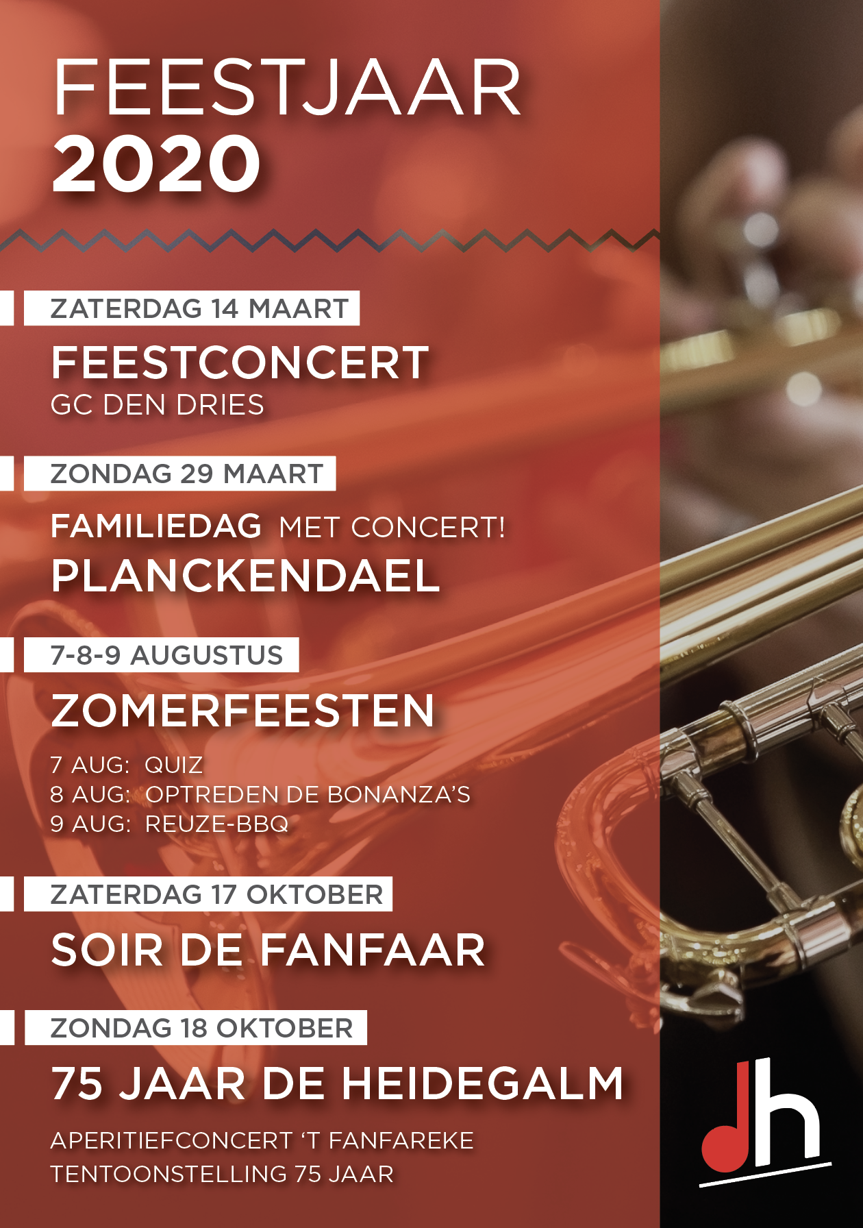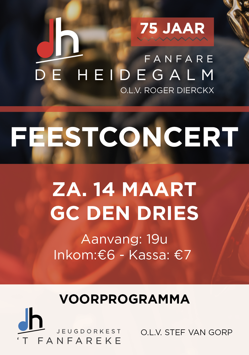 Rond 11u30 zullen we dan onze tentoonstelling ’75 jaar De Heidegalm’ openen. Tot 17u kan je onze fanfaregeschiedenis komen opsnuiven. De band ‘Wilma & the Freds’ zullen onze zondagmiddag het nodige cachet geven; voor de kinderen zijn er circusworkshops voorzien!
