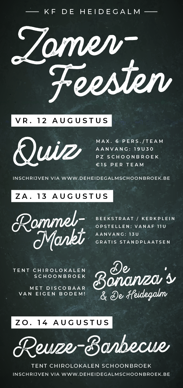 Een sfeervolle, muzikale avond met Schoonbroekse zangtalent en fanfare De Heidegalm. Muziek die iedereen kent en waar je luidkeels mee kan meezingen. Nadien neemt DJ Django je mee tot in de vroege uurtjes.